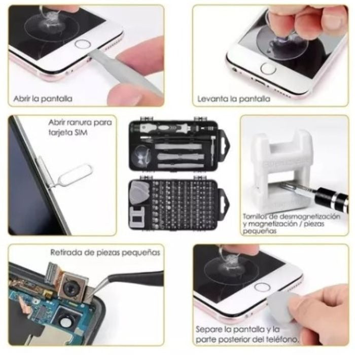 Este kit incluye una amplia variedad de puntas de destornillador, asegurando que tengas la herramienta adecuada para cualquier trabajo. Equipado con pinzas de precisión y paletas, es ideal para trabajos delicados y detallados.